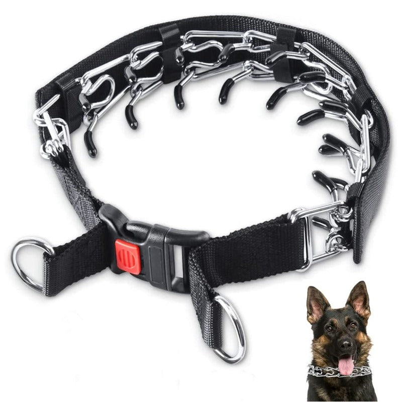 Pinch collars are designed to mimic the natural corrective behavior seen in dog packs. When a mother dog corrects her puppies or when dogs correct each other, they use a gentle nip on the neck. The design of pinch collars, with evenly spaced prongs, ensures that a mild, uniform pressure is applied around the neck, similar to the corrective action in nature. This method of communication is more easily understood by dogs, helping to establish clear and effective boundaries.